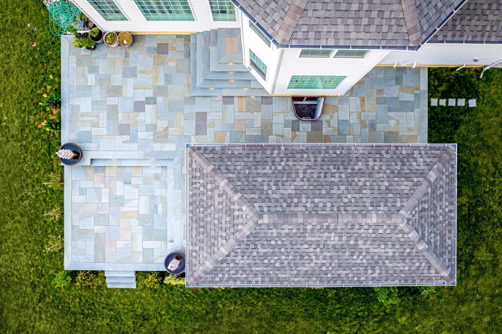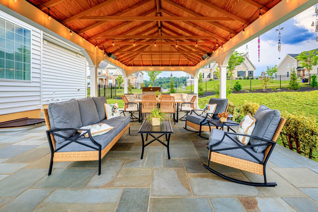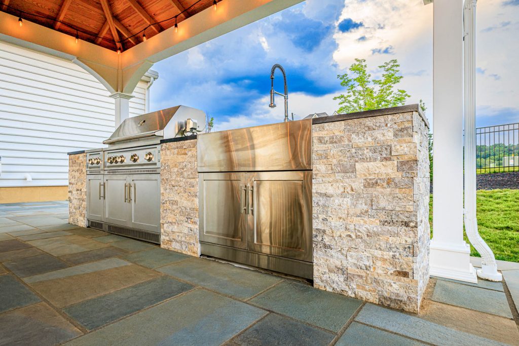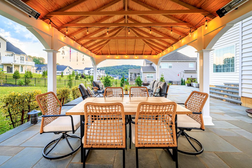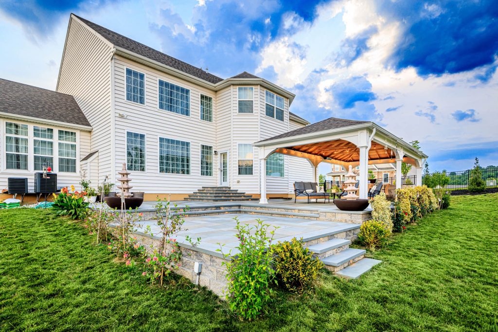 This custom backyard project in New Town Square features a multi-tiered hardscape patio designed for both form and function. The layout includes broad natural stone walkways and steps, a built-in outdoor kitchen with granite counters, and a timber-style pavilion that creates a shaded lounge area ideal for gatherings.