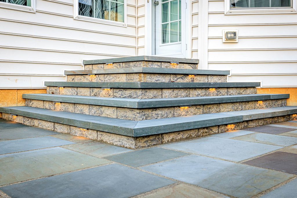 Stone veneer accents tie together the steps and outdoor kitchen, while under-step lighting adds warmth and nighttime visibility. From outdoor cooking to comfortable seating, this space was built for relaxation, hosting, and lasting durability.